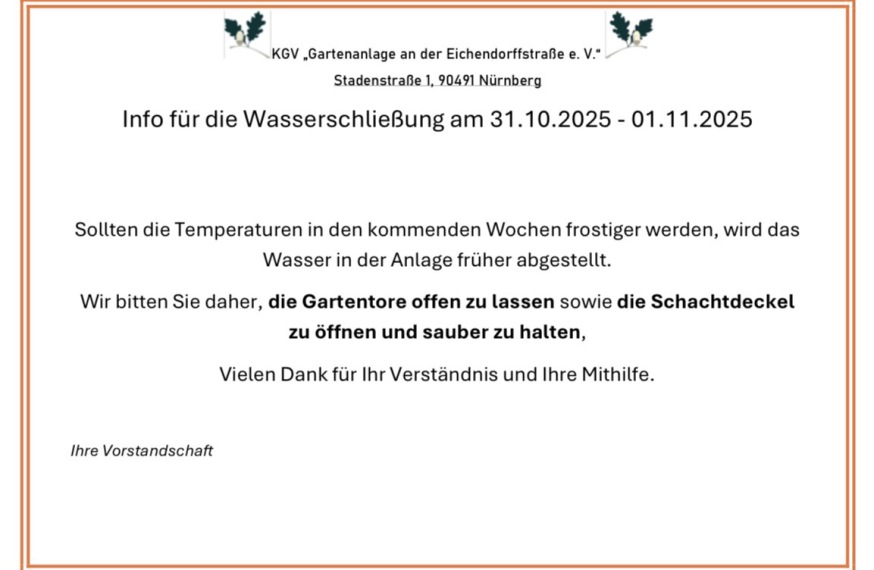 · Erwin wird nachdem die Wasseruhren eingebaut sind das Wasser aufdrehen. Schäden ggfs. mitteilen.
