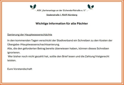 Sehr geehrte Pächterinnen und Pächter, sehr geehrte Gartenfreunde, wie bei den meisten Vereinen in der Jahreshauptversammlung bereits angesprochen wurde, gibt es Probleme mit den Hauptübergabeschächten der jeweiligen Kleingartenanlage. Der Wasserversorger die N-Ergie verlangt von der Stadt Nürnberg als Eigentümer der Fläche und von uns den Verbrauchern eine Absicherung der Trinkwasserleitung mit einen Systemtrenner. Außerdem steht die Forderung im Raum die teilweise über 80 Jahre alten Wasserschächte nach den gültigen Sicherheitsbestimmungen und Betriebsschutz konform auszurüsten. Es steht auch von Seiten des Energieversorgers die Drohung im Raum, wenn keine zeitnahe Umrüstung erfolgt, die Lieferung einzustellen da er keine Gefährdung des Trinkwassers durch nicht entsprechende Absicherungen gewährleisten kann.