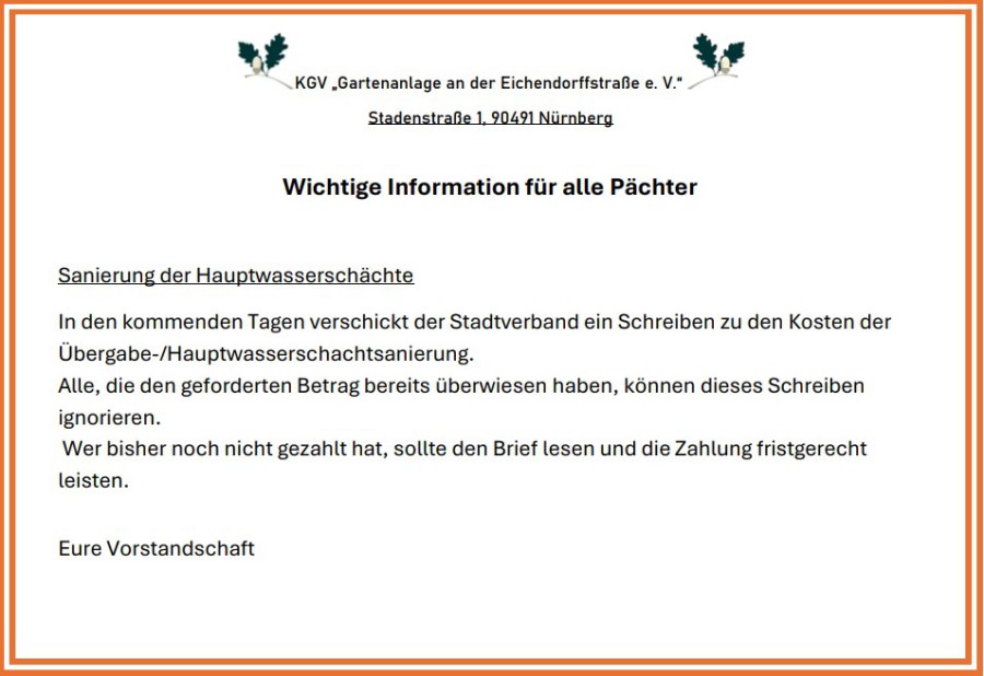 entschlossen gemäß Satzung § 9 Abs. 1 in der nächsten Vertreterversammlung im Juli 2025 einen Antrag zu stellen, dass eine einmalige Umlage in Höhe des dreifachen des Mitgliedsbeitrages 162,00 € zweckgebunden für die Sanierung der Hauptwasserschächte erhoben wird. Dieser Antrag wurde in der Sitzung des Verbandsausschuss am 03.04.2025 beraten und bei der Probeabstimmung mit 69 von 79 Stimmberechtigten angenommen. Sollte dieser Antrag in der Vertreterversammlung eine Mehrheit erhalten so werden wir diese Summe von jedem Pächter zum 01.10.2025 erheben. Wir informieren mit diesem Aushang bereits heute jeden Pächter damit er sich rechtzeitig darauf einstellen kann. Sollten die Vereine bereits einen Beschluss gefasst haben das Sie